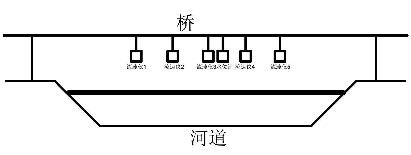 將流速儀探頭均布在橋的上方,用支架固定牢靠,調(diào)節(jié)流速儀的安裝角度,45-60°為適合的角度;雷達(dá)水位計(jì)放置在橋梁中間并用支架固定,多臺(tái)流速儀和水位計(jì)通過4芯電纜穿管走線至站房內(nèi),并連接至站房內(nèi)的遙測終端機(jī),遙測終端機(jī)將數(shù)據(jù)匯總上傳。(備注:橋可以用纜道代替)