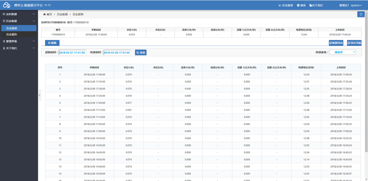 遙測終端機(jī)每5分鐘(可根據(jù)情況設(shè)定)采集底層傳感器的數(shù)據(jù),并將其發(fā)送至相應(yīng)的服務(wù)器,通過數(shù)據(jù)查看平臺(tái)可以實(shí)現(xiàn)實(shí)時(shí)數(shù)據(jù)的查看、歷史報(bào)表、歷史圖形、導(dǎo)出excle等。
